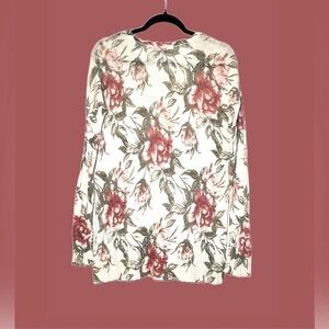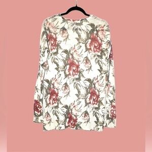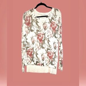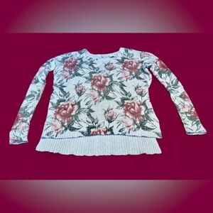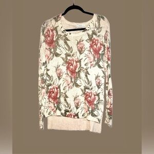 Abercrombie & Fitch Floral Boat Neck Long-Sleeved High-Low Sweater. Ivory with slightly muted multicolored florals made from a delicate knit weave of high-quality blend of Cotton, Viscose, Linen, and Wool. Lightweight and feminine all-season sweater.