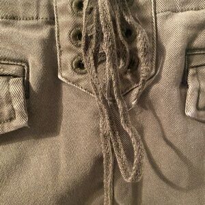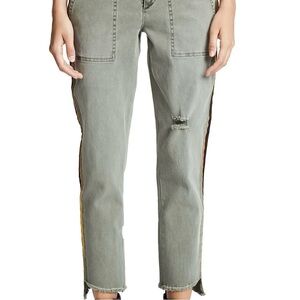Pam & Gela At-ease olive green stretch cotton twill pulls rank with silky side stripes on these slim-cut pants detailed with angled step hems and back lacing. Cotton blend. Light fading and whiskering along front. Front and back pockets. Contrast striping along sides. Back lace-up detail. Frayed step hem.
