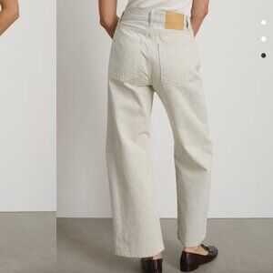 Our popular Lasso Jean cut from double faced Japanese denim. The imperfect white twill lines marry with our signature outseam construction for a unique look. Rinsed for a relaxed structured feel. Designed to sit at the natural waist with a pieced outseam, kinked leg shape, cropped length and roped hem.