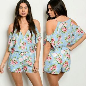 This Is A Gorgeous Blue Cold Shoulder Romper. Has A Vneck. Made from 100% Polyester. These rompers were bought new wholesale. They don't have any tags.