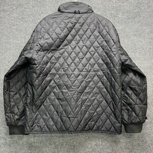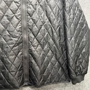 Mens black quilted bomber jacket designed for DHL. This jacket features a classic diamond quilting pattern throughout and a full zip front closure. It has a stand-up collar and ribbed cuffs and hem for a comfortable fit. The interior tag indicates size L, style 943241, color black, and is made of 100% polyester.