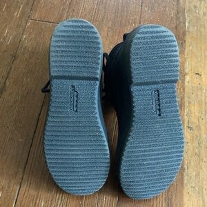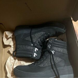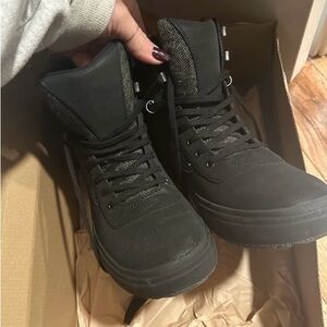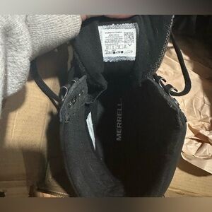 Size 8.5 Merrell Waterproof Winter Boots. Great support and traction. Stylish black leather and black tweed fabric. Excellent condition with very slight tread wear to outer heels. See photos.