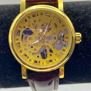 Gold tone. Elegant turtle brooch with blue and gold accents. Features a large blue gemstone and intricate detailing. In good condition.