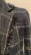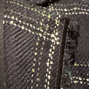 Stylish navy blazer with a checkered pattern. Features frayed edges for a modern touch. Ideal for professional or casual wear.