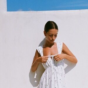 Embrace elegance with this chic white floral maxi dress. Its timeless design and delicate floral pattern make it a perfect choice for any occasion. The Mia floral maxi dress in “Bluebell”. Lace up bodice is functional. Very soft and comfortable. Sustainable fabrics. Cotton and Lyocell blend. Prairie boho chic style.