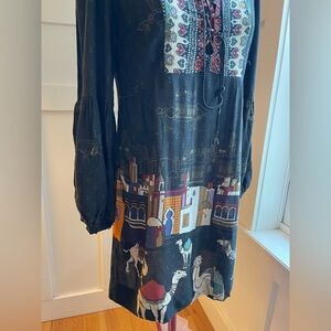 Chic black dress with vibrant cityscape design. Long sleeves and lace-up neckline. Unique and stylish.