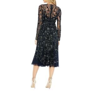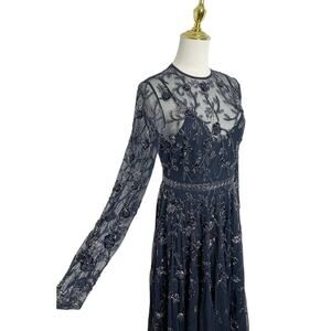 Beautiful Mac Duggal dress in a rich navy tone, featuring intricate beaded and sequined embroidery throughout. This style includes a sheer illusion neckline and sheer long sleeves for an elegant, refined look. The fitted bodice flows into a soft A-line midi skirt that moves gracefully and photographs beautifully.