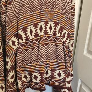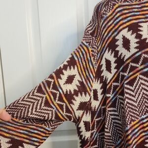 Stylish knit with intricate patterns. Features burgundy and cream colors.