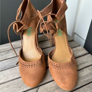 Fig and Ivy brown block heel pumps with ankle lace ups