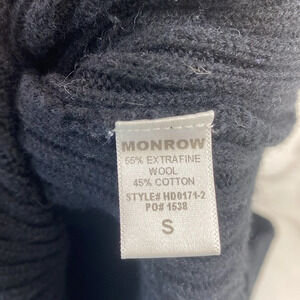 Monrow Elbow Slash Sweater Dress Womens Size Small Black Wool Cotton Ribbed Knit. Long Sleeves. Crewneck. Unlined. Elbow slits. Rib knit fabric. 55% Extra Fine Wool, 45% Cotton. Monrow Style HD0171-2. Revolve.