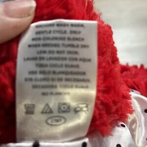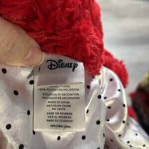 Red furry buttoned Minnie jacket. Black and white polka dot lining.