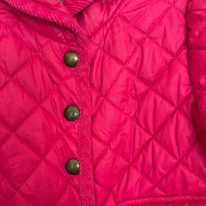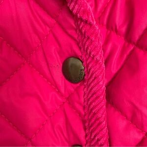 Bright fuchsia quilted jacket. Features button closure and cozy design. Ideal for cool weather.