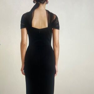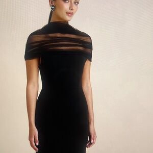 Maxi Length, cap sleeve tulle off-the-shoulder, Tulle contrasting neck feature, central back zipper closure and fully lined. Elegant and sophistated.