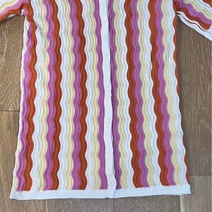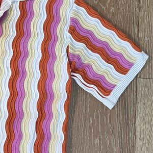 A twist on the classic t-shirt dress, the Felix Knit Dress features multicolored scalloped waves and a soft folding collar for a luxe but comfortable feel.