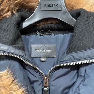 Stylish navy puffer with luxurious real fox fur trim collar and beautiful black leather trim at pockets and zipper. Double zipper for extra warmth and Mackage signature asymmetrical silhouette. Perfect for winter warmth.