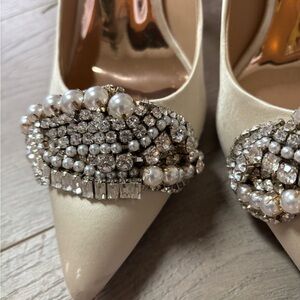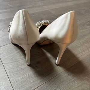 Elegant cream heels by Badgley Mischka, featuring stunning embellishments for a touch of glamour. Perfect for special occasions.