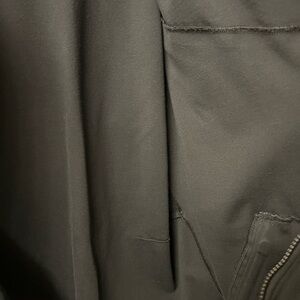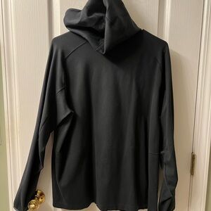 Sleek black jacket with full zip. Features a hood and subtle design accents. Solid black logo. No holes no piling no issues