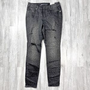 Size 8P black jeans with leopard print. Mid rise skinny style. New with tags. Waist 14in. Inseam 27in. Rise 9.5in.