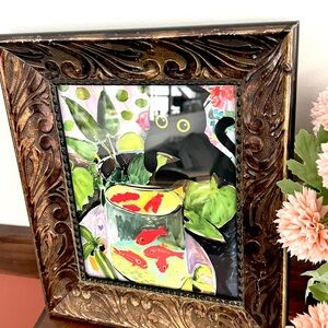 The cutest black cat and goldfish bowl canvas print. Framed in an ornate, thick, bronze frame. Ready to hang. 11.5x13.5” Some wear to frame.