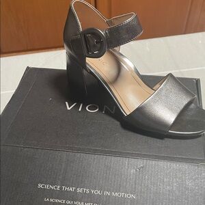 Elegant Vionic heels in metallic silver, tan, and black. Stylish and comfortable for any occasion.