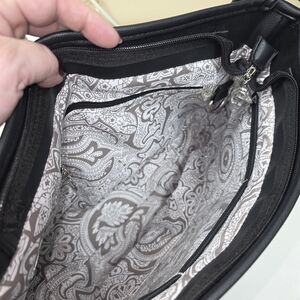 Bella Russo Black Faux Leather Shoulder Bag, new with tags and designed for both fashion and function. The sleek black exterior features, an easy-access front zipper pocket, and a stylish tassel charm paired with delicate heart shaped hardware accents. Inside, the purse opens to a detailed paisley print lining with three roomy plastic compartments, plus an additional zip closure pocket.