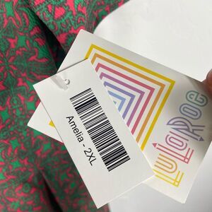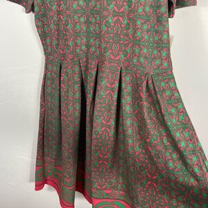 Stylish LuLaRoe dress with intricate green and pink pattern. Short sleeves and knee-length design. Perfect for casual outings.