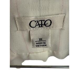Add a touch of sophistication to your wardrobe with this beautiful Cato 2-piece suit. This set includes a stylish jacket and matching pants, both in a delightful cream, pink, and gray striped pattern. The suit is designed for women and comes in a size 14.