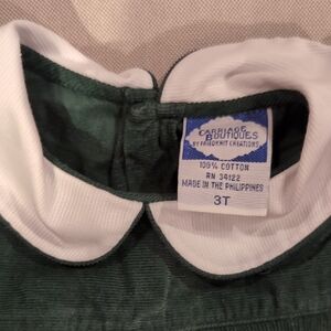 Forest green corduroy dress with white collar and cuffs. Features smocked detail with santa and sleigh
