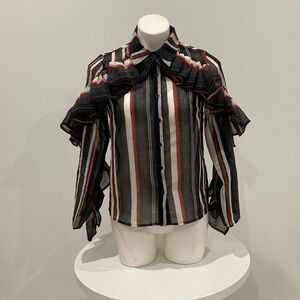 NEW GRACIA Black White Red Stripped Button Down Ruffle Blouse M