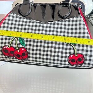 Gingham cherry skull purse!!! Super Cute and the black-and-white gingham featuring an adorable !!! embroidered skull cherries and glossy black patent details. Vintage clasp top, perfect for a bold everyday accessory. I only used it once it’s in good condition just a bit dusty ! I’m open to offers !