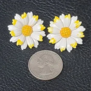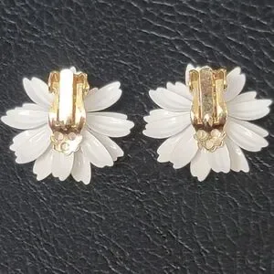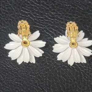 Vintage Yellow & White Daisy Enamel Metal Earrings, Clip On - Estate