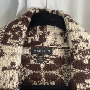 Madison open front cardigan in brown and cream with a geometric knit pattern inspired by Scandinavian and Nordic sweater designs. Made from pure wool, this cardigan has a cozy medium weight feel, fold over lapel, and relaxed open silhouette that layers easily for fall and winter. The pattern gives it a classic, timeless look that works well for cabin trips, cool weather travel, or everyday wear.