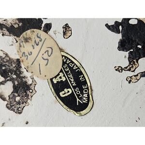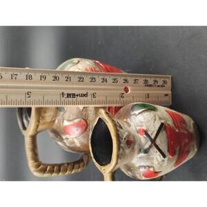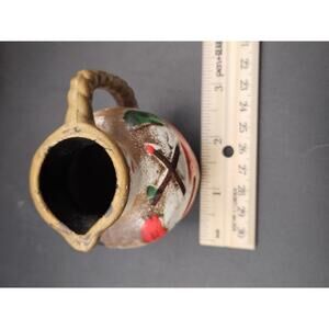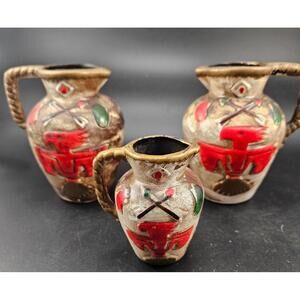 A charming trio of ceramic decorative pitchers/creamers marked "G & A LOS ANGELES MADE IN JAPAN" (mid-20th century). This unique set includes two larger pitchers (4 5/8 in tall) and one miniature pitcher (3.0 in tall). They feature a striking Native American style Thunderbird motif and a textured finish in brown, gold, red, and green, giving them a wonderful Southwestern kitsch appeal. These little jugs are perfect for holding small trinkets, serving cream, or using as miniature bud vases. This set is the perfect gift for a collector of vintage Japanese pottery, kitsch decor, or those who appreciate mid-century Southwestern style.