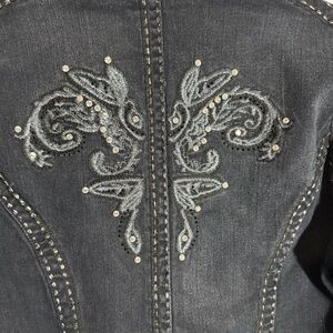 Ethyl brand women's long denim duster jacket with western-style embellishments. The jacket is black and features intricate white/silver embroidery and bejeweled accents along the placket, collar, cuffs, and hem