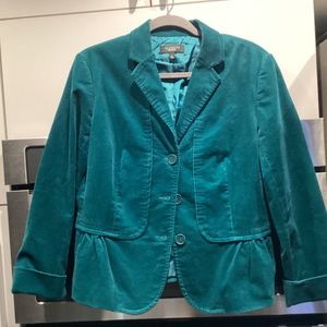 Chic teal suit jacket with button front. Tailored design with classic lapel. Ideal for office or casual outings.