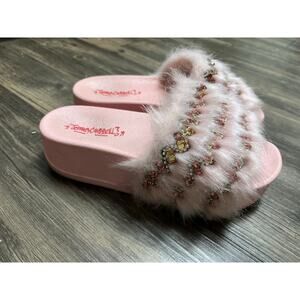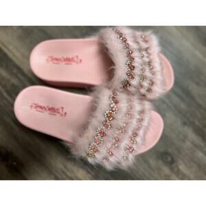 Jeffrey Campbell Edie Slide Sandal Pink Fur Jeweled Slip-On Slides Glam Cozy 8