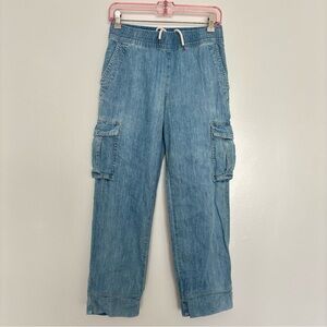 Our Washed Denim Cargo Pant is made from lightweight, soft Italian denim. This fabric offers a soft and comfortable all day wear. Style details include elasticized waistband with internal drawcord, front slash pockets, side cargo pockets, back patch pockets. Casual fit. Additional Information: • 100% Cotton