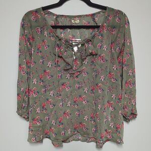 Green sheer pink floral blouse. Cute ruffle and cross strap neckline. Sleeves are three quarters with elastic band.