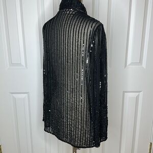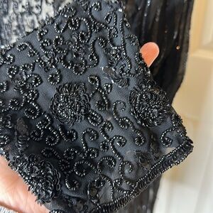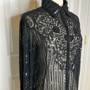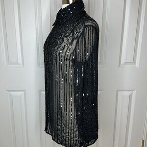 Elegant black lace top. Features intricate sequin detailing. Perfect for evening wear. This is a really nice blouse. Missing sequins here and there but like the previous owner noted you can’t really tell. This blouse is a little too big for me.