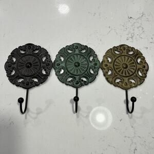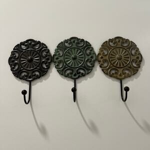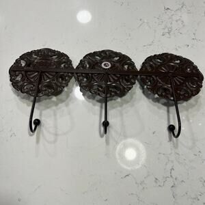 Add charm and functionality to your home with this beautiful New View three medallion wall hook rack. Featuring intricate medallion designs in earthy shades of brown, green, and gold, this piece offers both decorative appeal and practical storage. Perfect for hanging coats, keys, hats, or decorative items, it’s a versatile addition to any entryway, bedroom, or hallway.