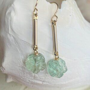 Hand Carved Fluorite Flower Earrings, Light Mint Green Translucent Gemstone