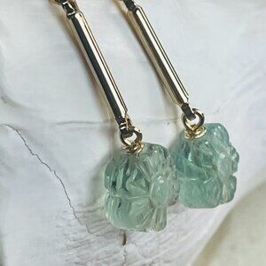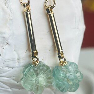 Bring a touch of soft, natural elegance to your jewelry collection with these hand carved mint green fluorite flower earrings. Each gemstone bead is carved into a delicate floral shape, showcasing fluorite’s naturally calming glow and subtle translucence. The flowers are suspended from sleek gold-tone bar connectors, creating a refined vertical silhouette that’s lightweight, feminine, and easy to wear.