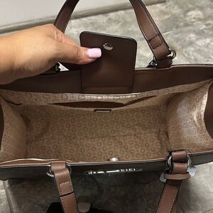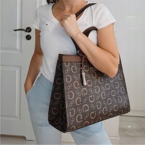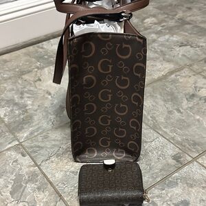 Elegant Guess tote with wallet. Features a chocolate brown monogram design.