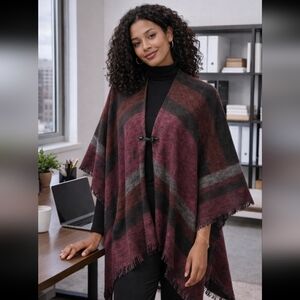 Elegant poncho with a stylish striped pattern. Features a blend of burgundy and gray tones. Perfect for layering.