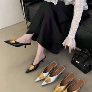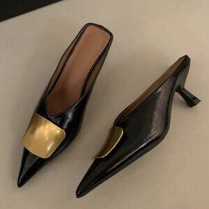 Fashionable Women's Metal Buckle Pointed Toe Thin Black kitten Heel mule Sandals