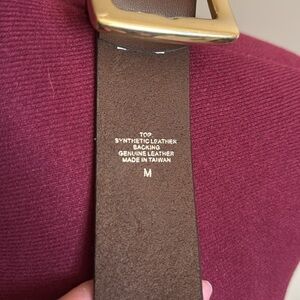 Some minor creasing and one small scuff on the back of the belt. Small minor scratch on the outside around the back ring of where your jeans would hit. The colors are brown with a gold belt buckle. Size medium.