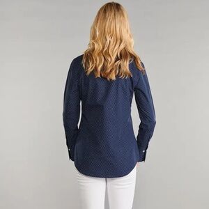 Are you a collar flipper? As you might have noticed, we love to flip up our collars. One day it occurred to us, why not create an entirely new fitted shirt style with a standup collar for those-like us-who love to flip their collars, too. The League is that very shirt! A fitted-style button-down it's built with a 2 1/2-inch-high collar reinforced with an inner lining to keep it standing tall and straight. Along with our high collar design, the neckline gracefully tapers to create a subtle V-neck opening. Like our popular Ivy fitted shirt style, The League, in a dark blue hue decorated with white polka dots (who doesn't love a polka dot—so happy), also features four-inch-long barrel cuffs with a single-button closure and engraved mother-of-pearl buttons.