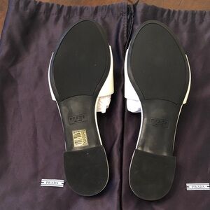 Elegant Prada sandals with gold logo. Chic cream color. Perfect for any occasion.