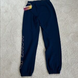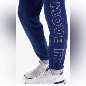 Mother Denim Move It sweatpants. Super soft. Dark Blue with light peachy/orange drawstring at waist and lettering down left leg. So soft and comfy you’ll never want to take them off!!