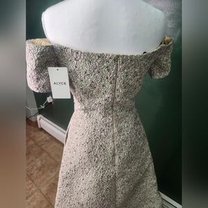 Elegant off-shoulder design. Delicate floral pattern with shimmering Perfect for special occasions.